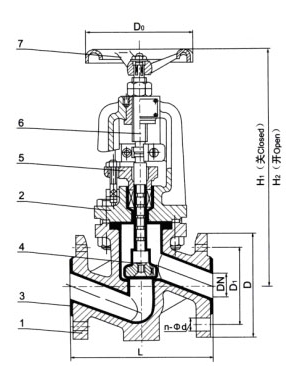 1、閥體、2、閥蓋3、閥體4、閥瓣5、壓蓋子6、閥桿7、手柄